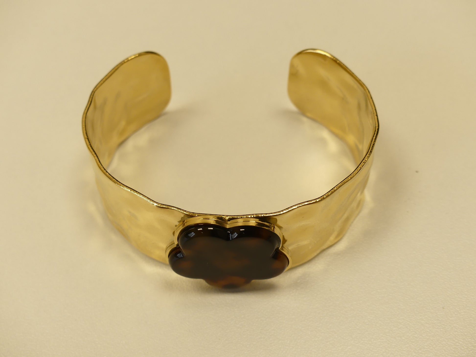 Bracelet jonc au design martelé, chic et raffiné. Réalisé en acier inoxydable doré, il est orné d’un élégant motif trèfle en résine effet écaille, qui apporte une touche de caractère et de modernité.