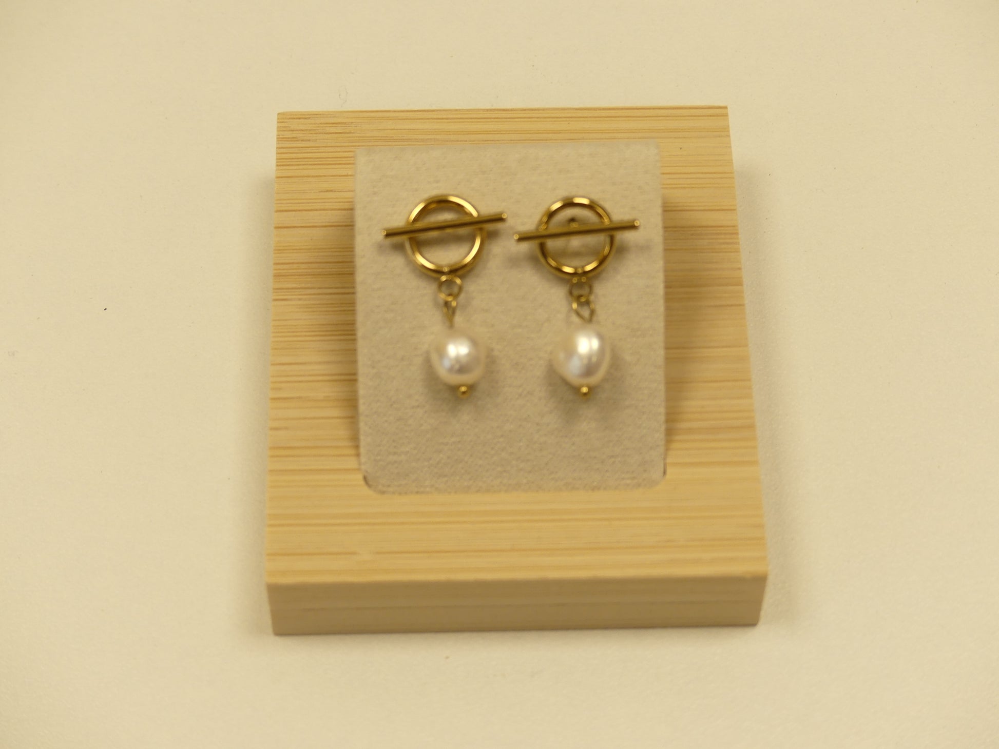 -Boucles d'oreilles à puce en acier inoxydable composées d'un anneau et barre avec une perle d'eau douce pendante.