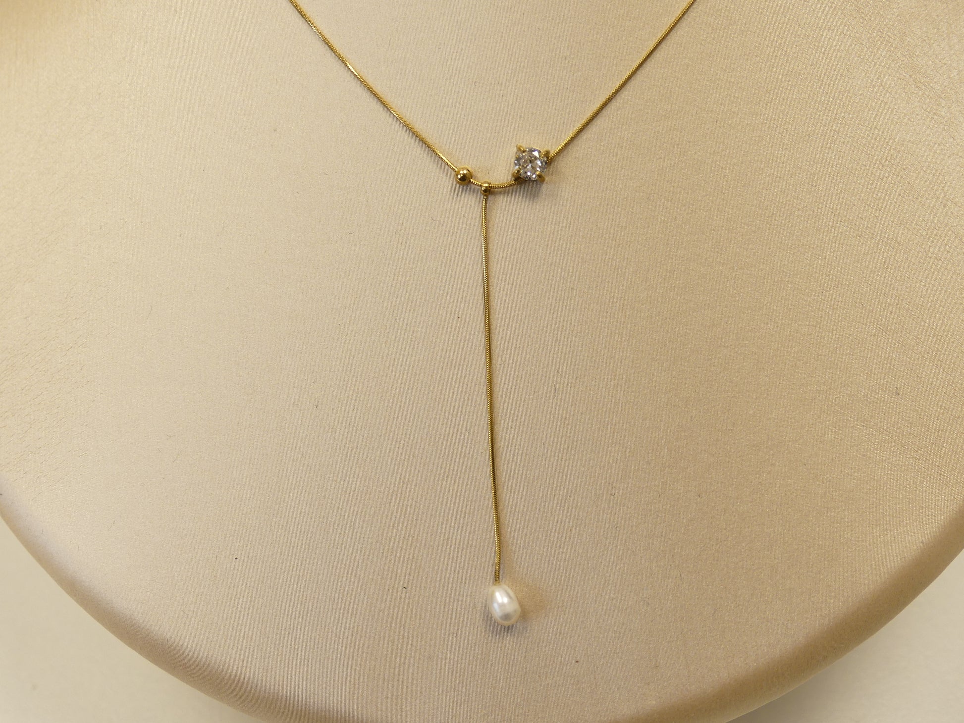 -Collier en Y sur chaîne en acier inoxydable composé d'une fine maille serpent avec un cristal taillé rond et une chaîne pendante ornée d'une perle d'eau douce.